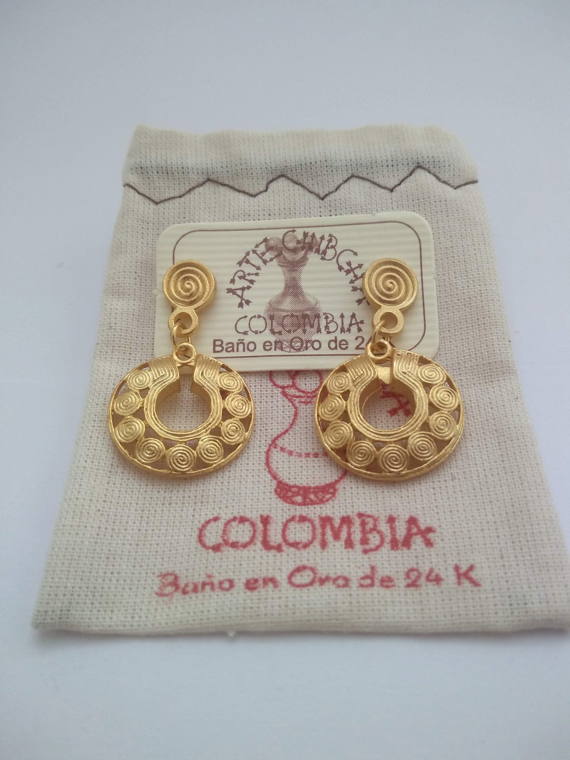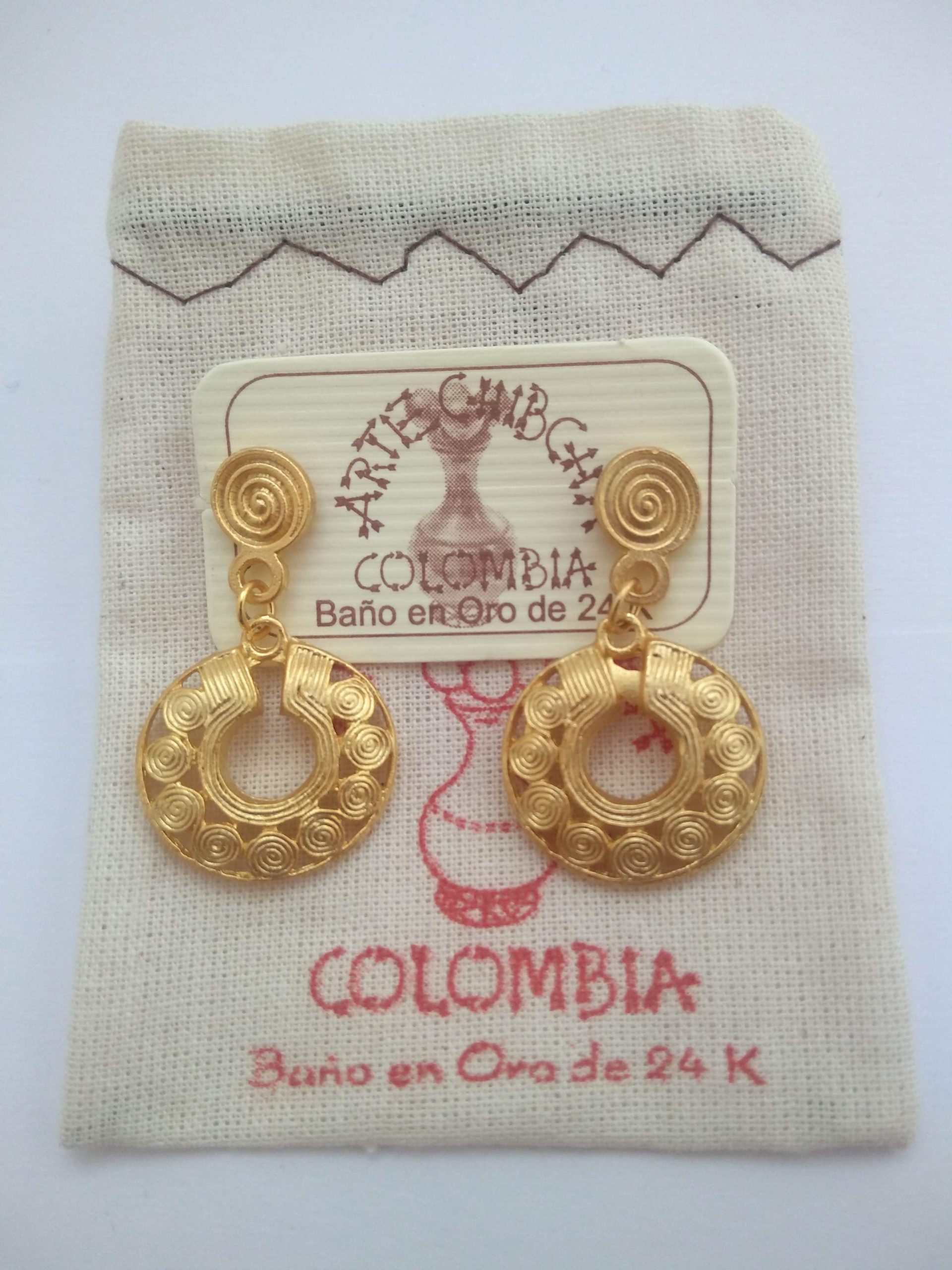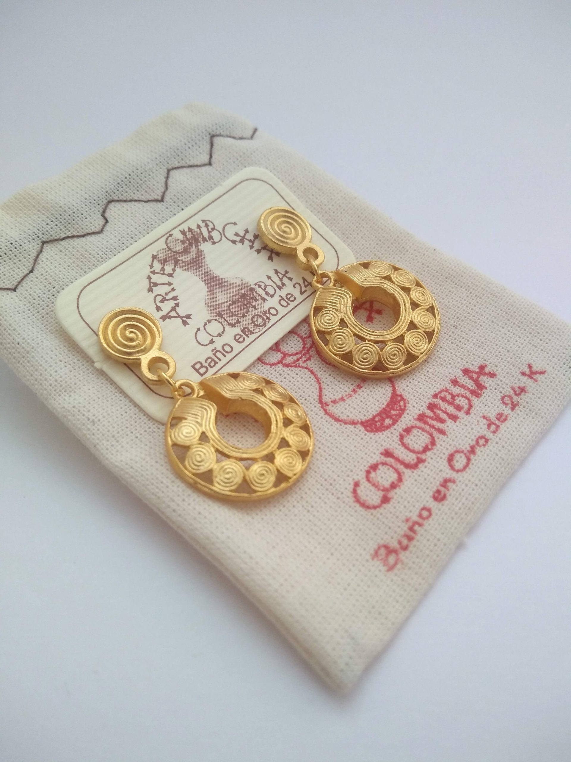 Elaborado con una aleación de metales, cuentan con un baño de oro 24 kilates con sistema puya antialérgico, así mismo cuenta con su respectiva bolsa protectora. Ref. Cal4-5