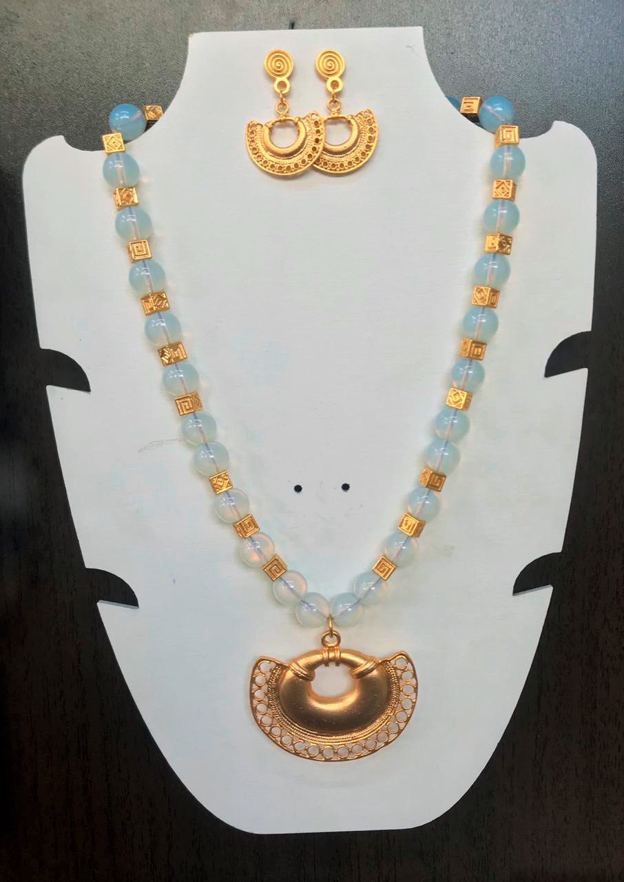Conjunto: Collar con piedra grande semipreciosa Opalo . Aretes y dije elaborados con una aleación de metales, cuentan con un baño de oro 24 kilates aretes con puya antialérgico, así mismo cuenta con su respectiva bolsa protectora. Ref. CP4 – Sin1 – Opalo.