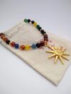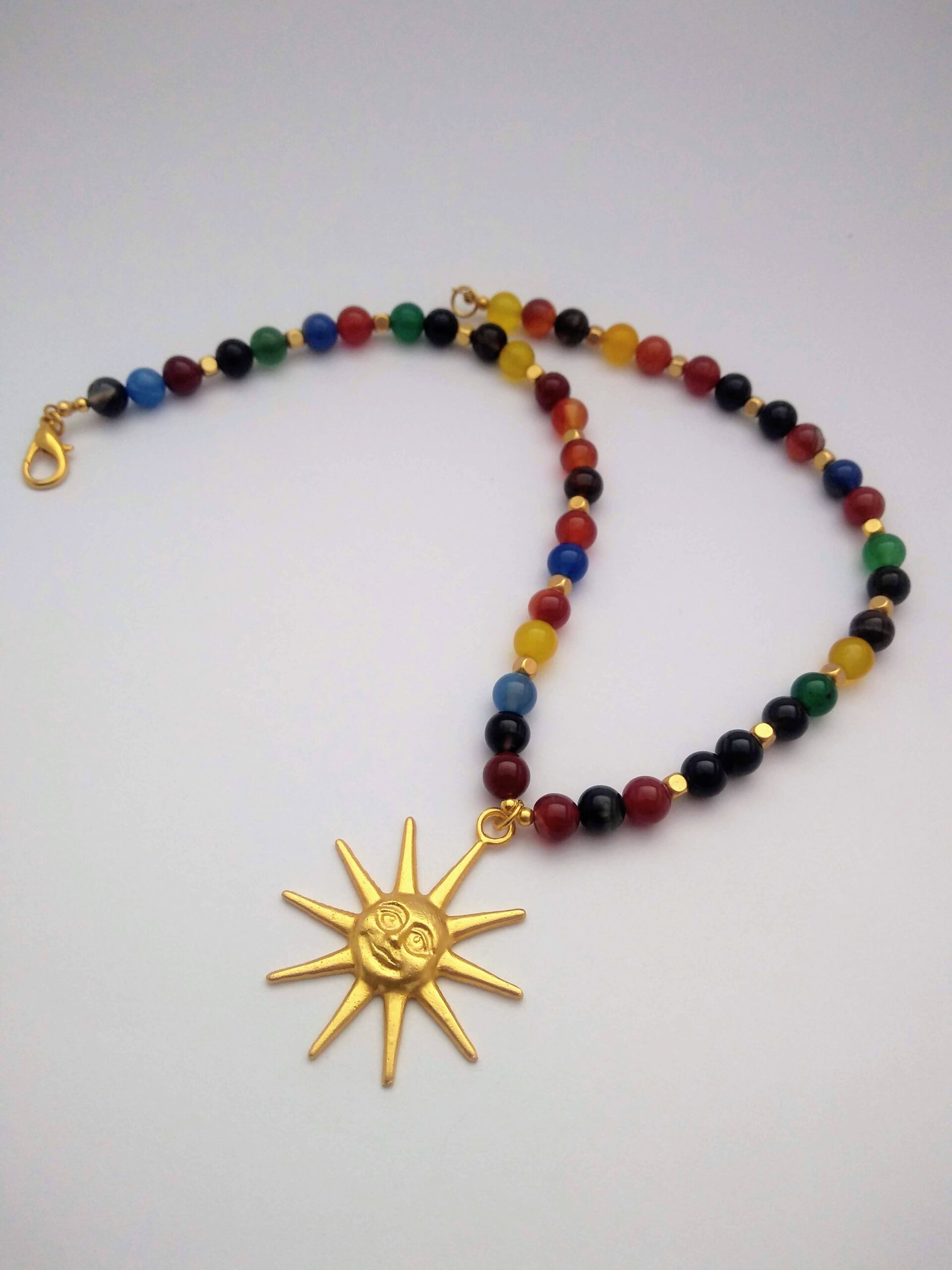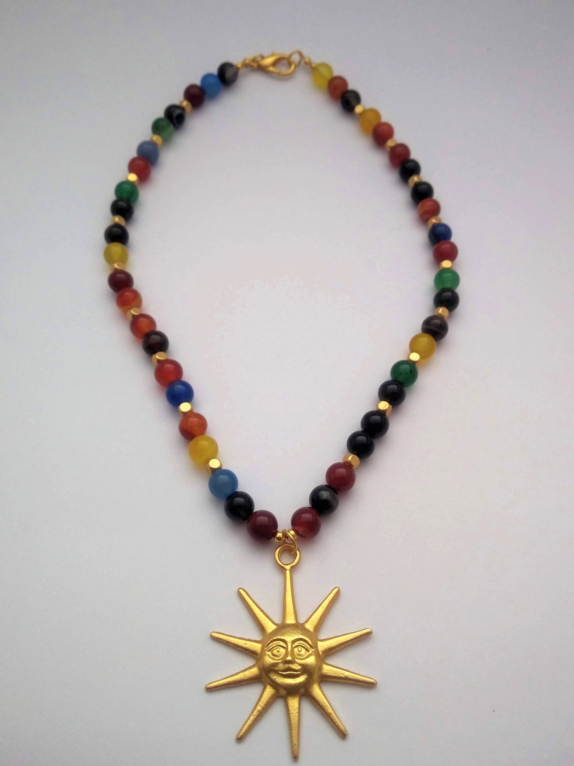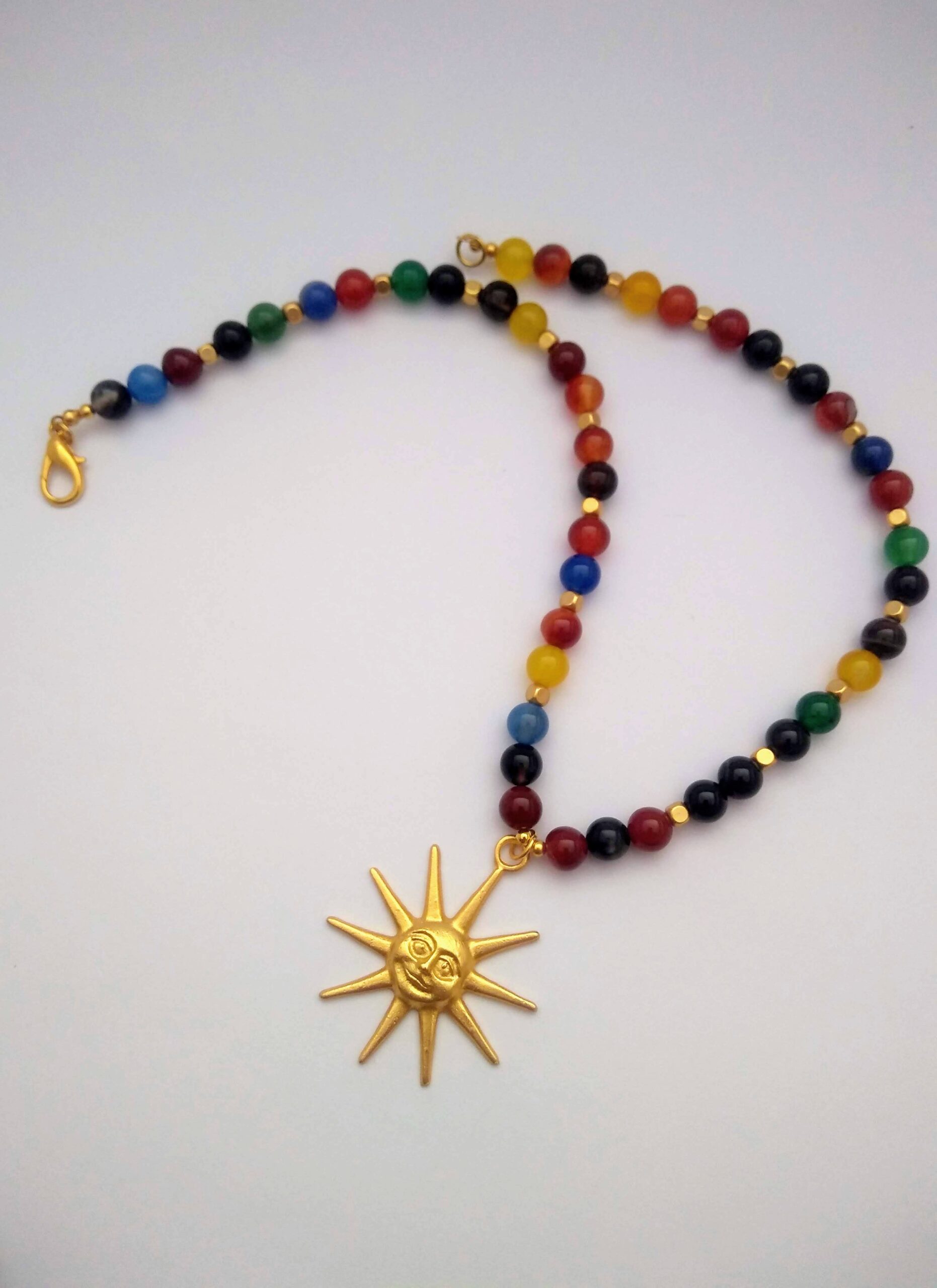 Collar con piedra semipreciosa Ágata Mix, dije elaborado con una aleación de metales, cuenta con un baño de oro 24 quilates antialérgico, así mismo cuenta con su respectiva bolsa protectora. Ref. CPi3-Cal7-Ágata Mix.
