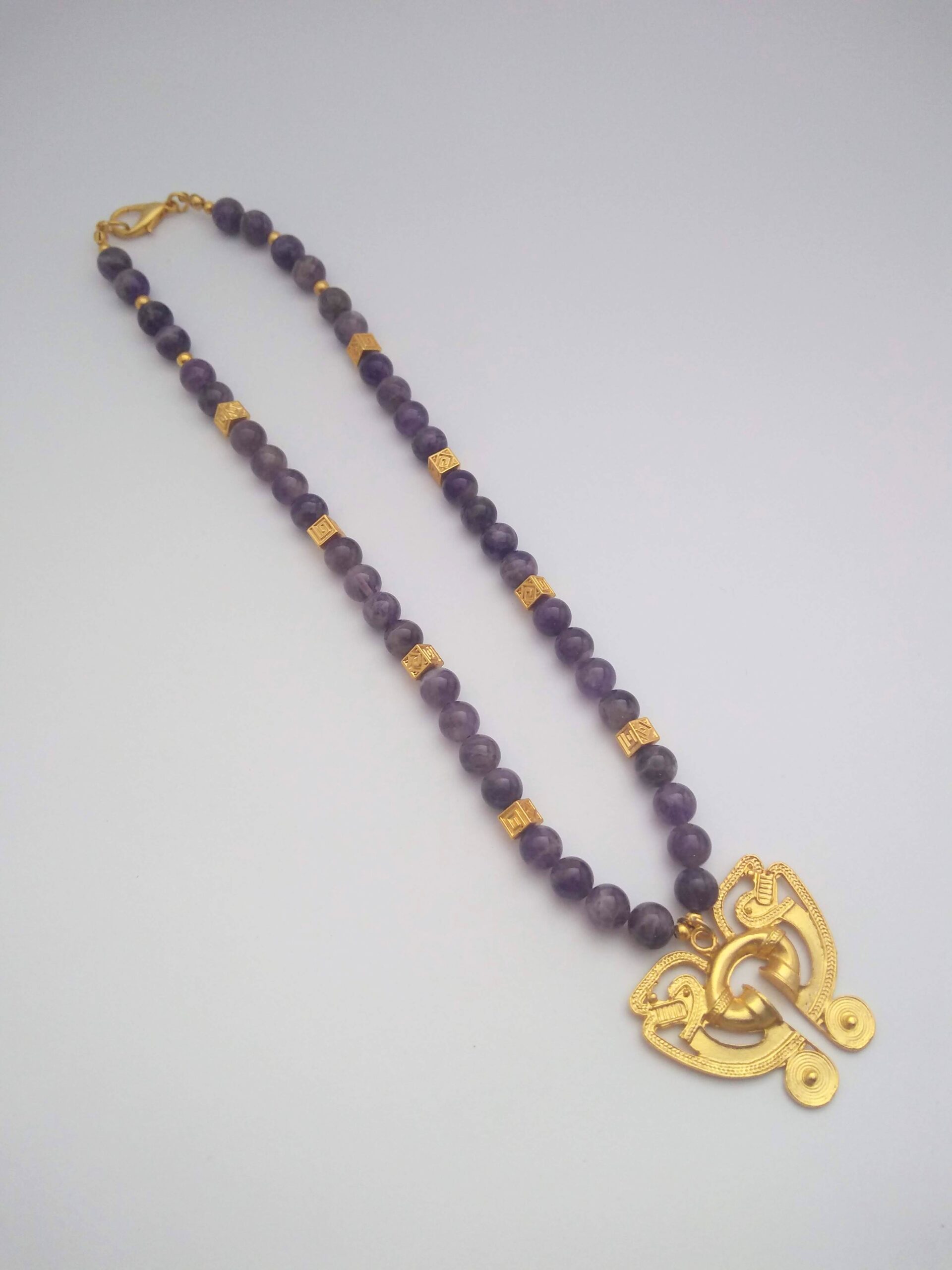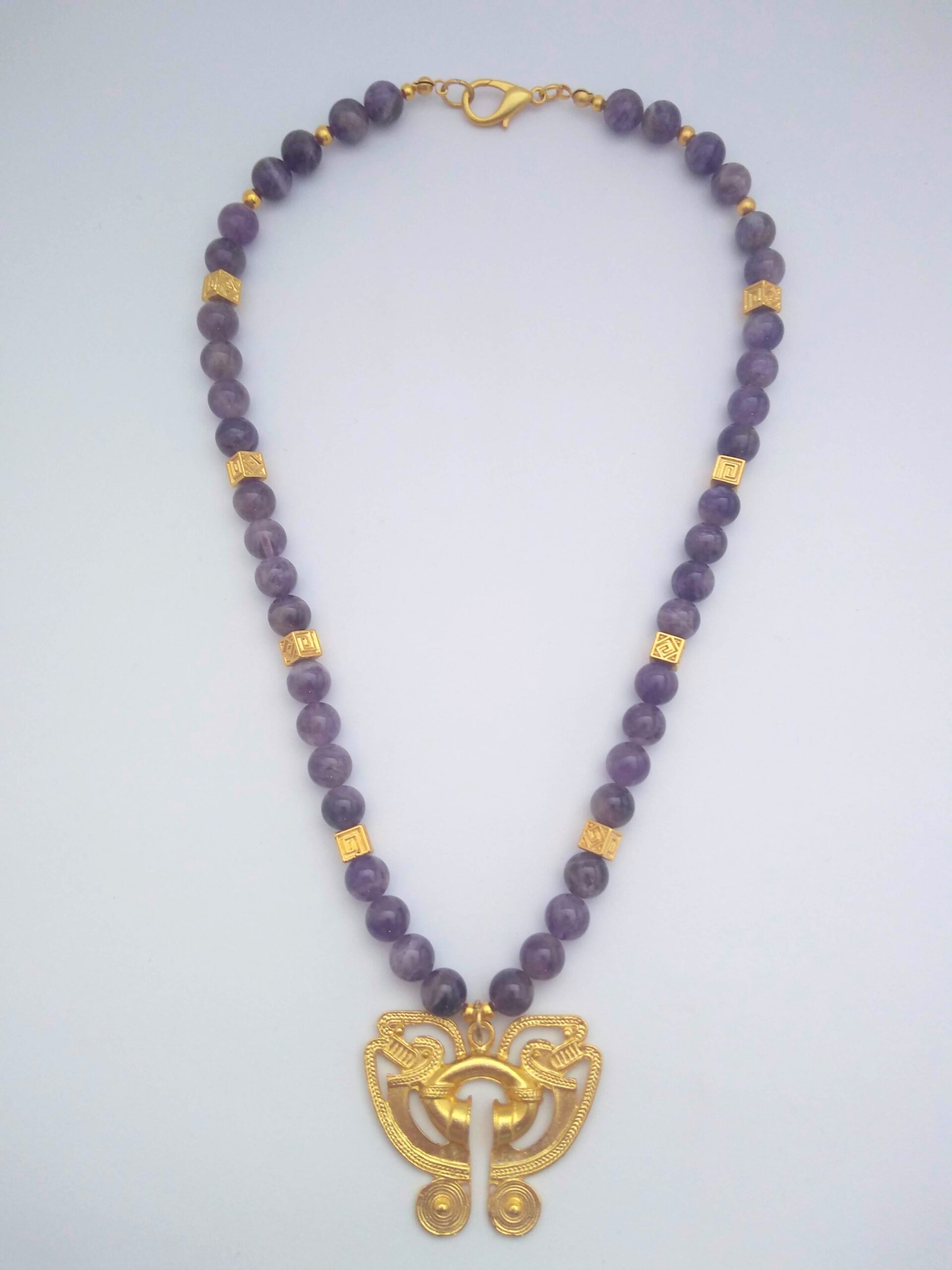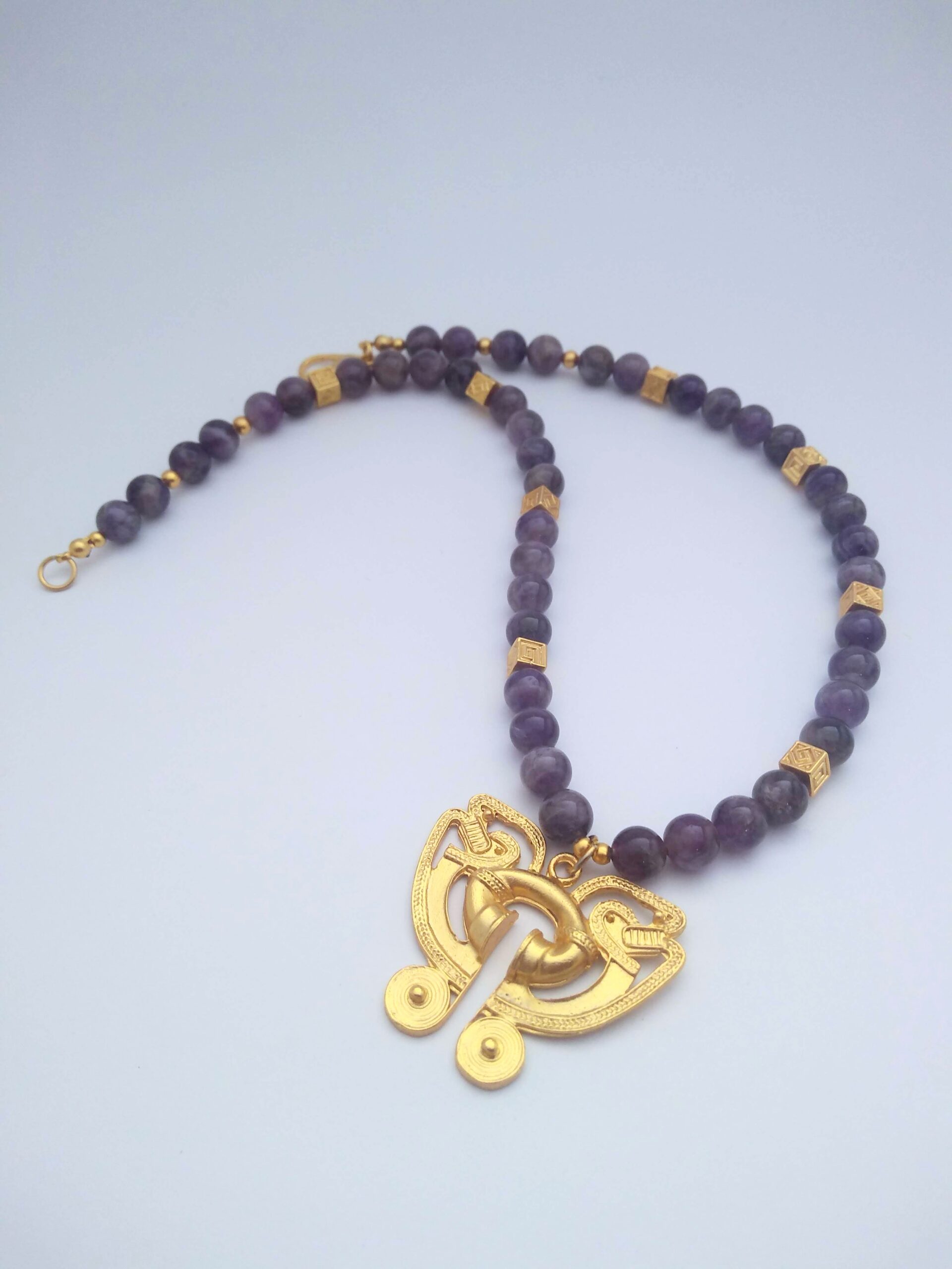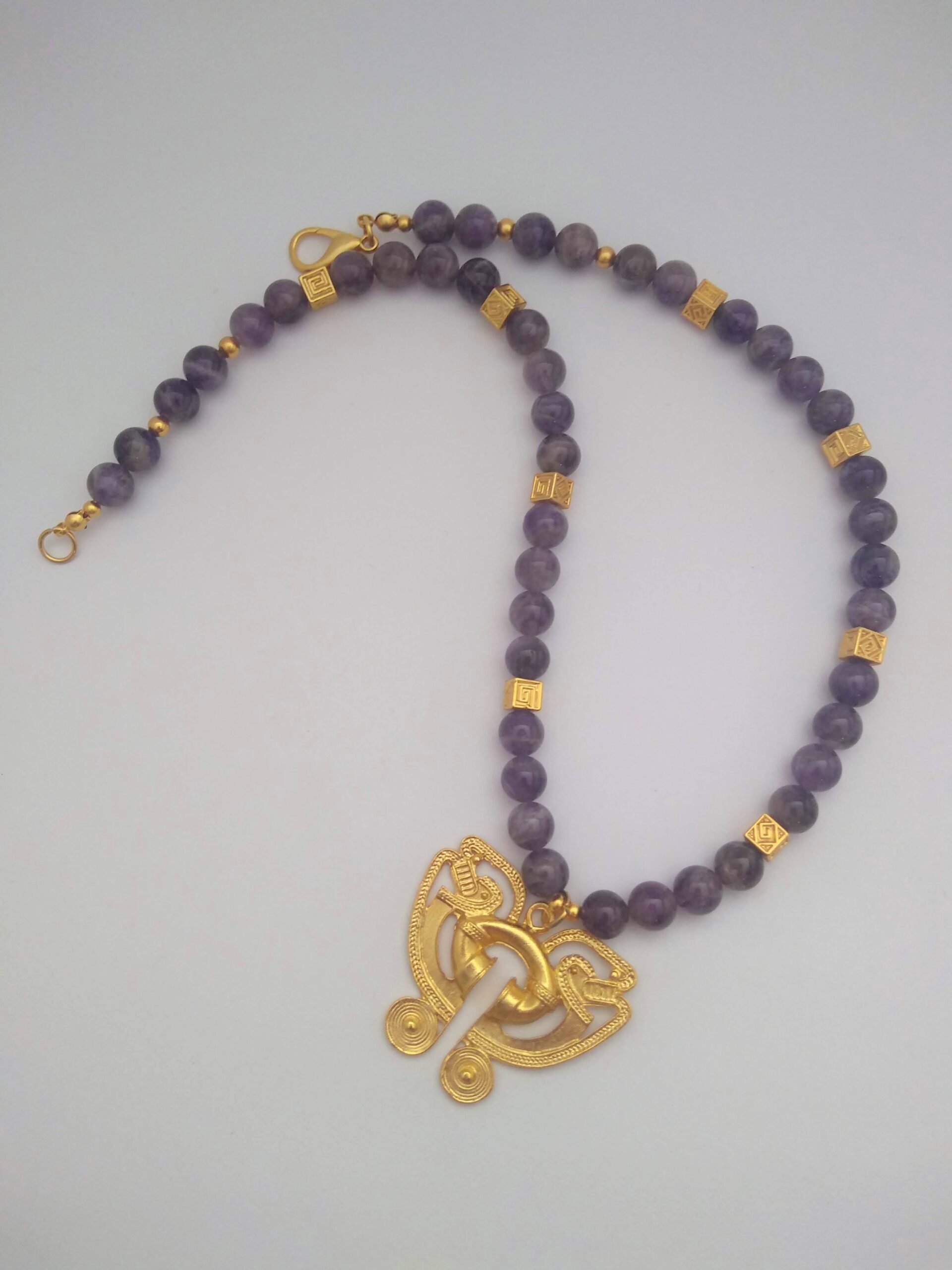 Conjunto: Collar con piedra semipreciosa Amatista. Dije elaborado con una aleación de metales, cuentan con un baño de oro 24 quilates arete con puya antialérgico, así mismo cuenta con su respectiva bolsa protectora. Ref. CP3 – Tai24 – Amatista