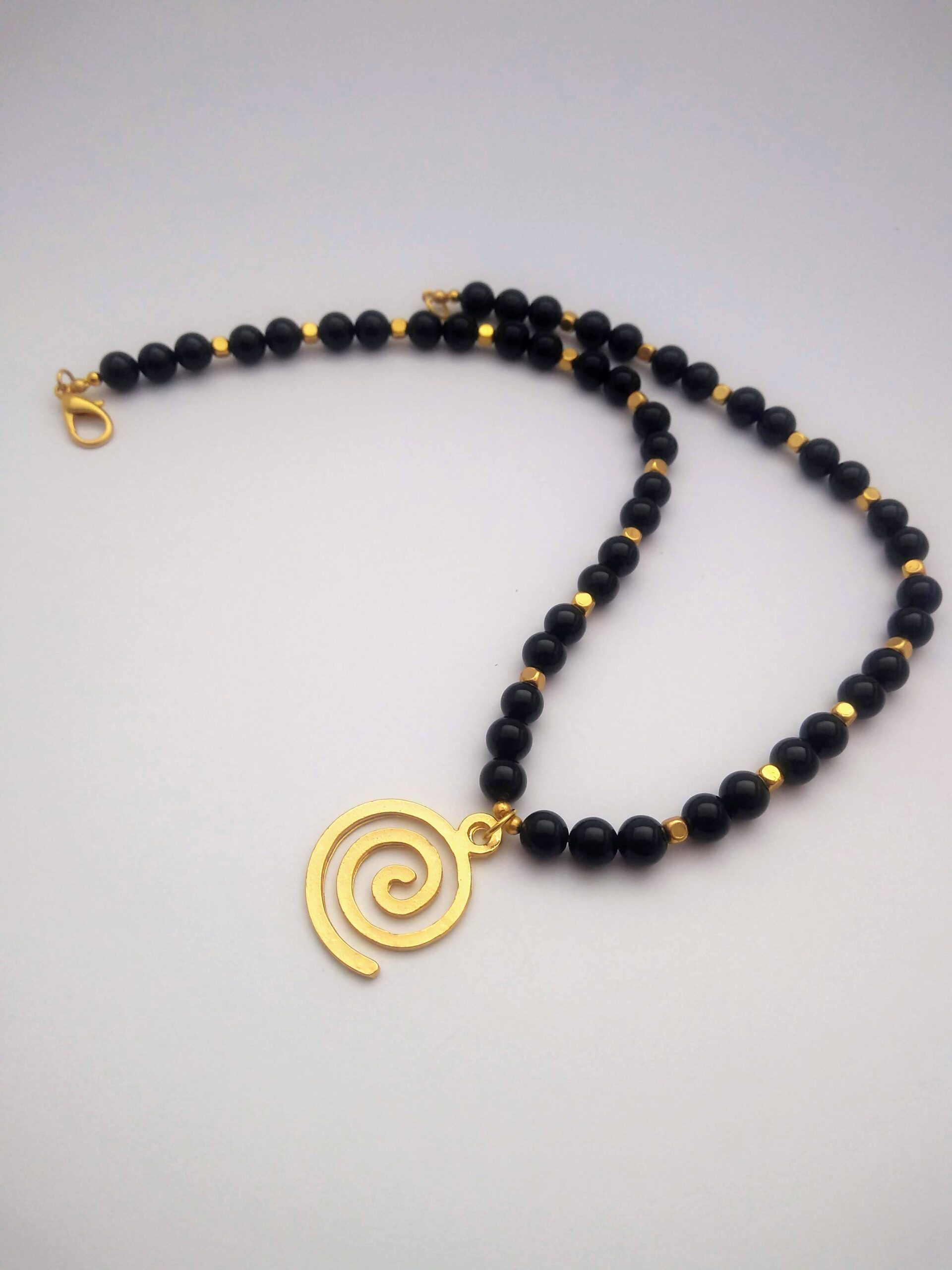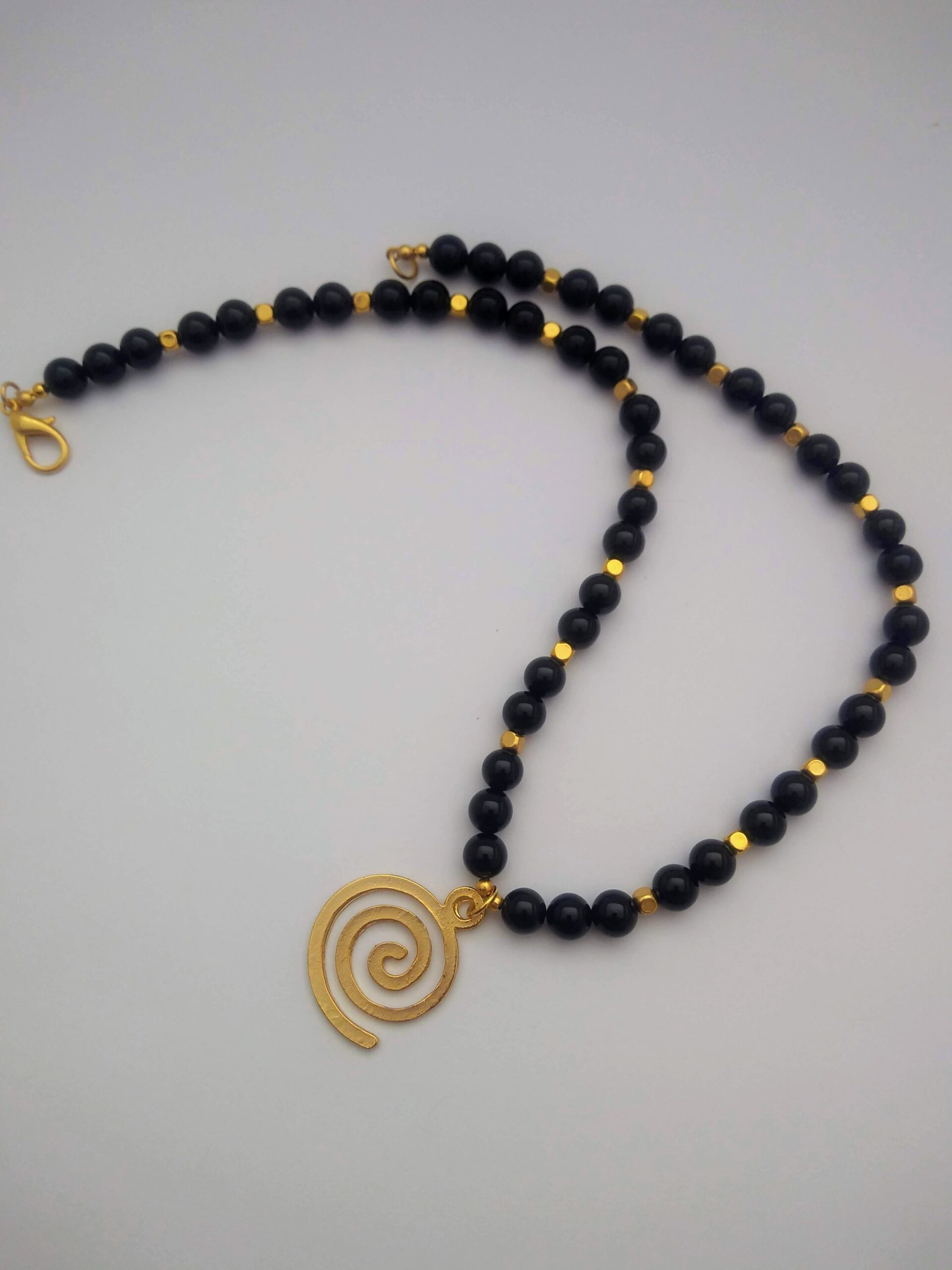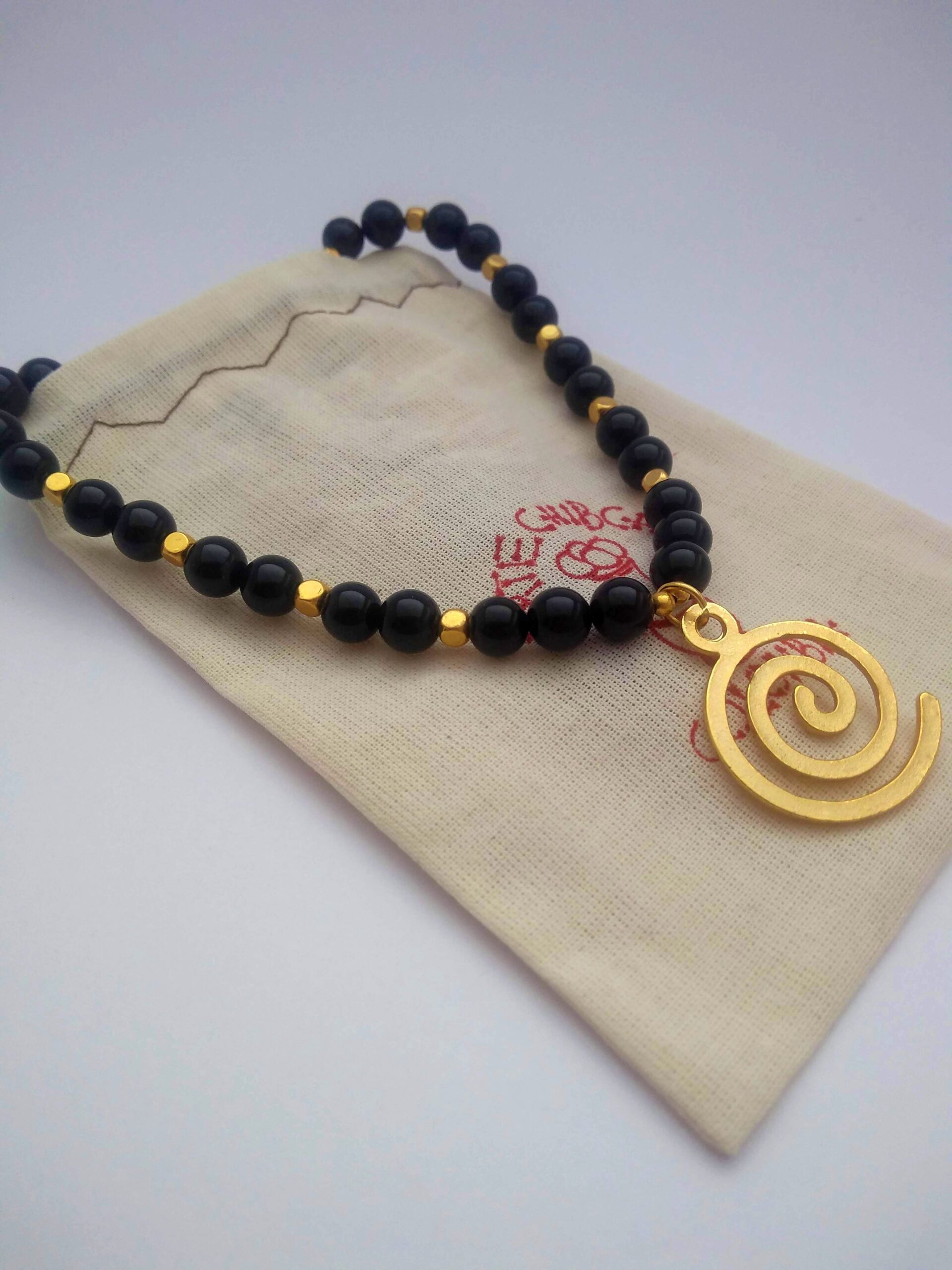 Collar con piedra semipreciosa Onix, dije elaborado con una aleación de metales, cuenta con un baño de oro 24 quilates antialérgico, así mismo cuenta con su respectiva bolsa protectora. Ref. CPi3-Mui28-Onix
